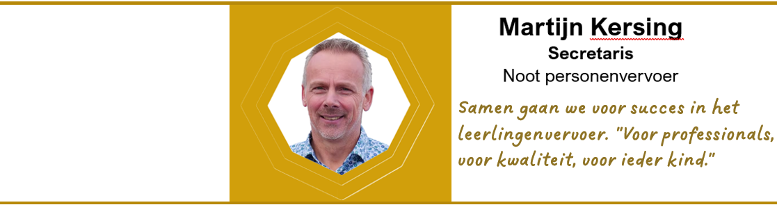 Mijn naam is Martijn Kersing. Ik ben directeur/eigenaar van Noot Personenvervoer, een van de grotere landelijke vervoerders op het gebied van contractvervoer. In 1997 ben ik bij Noot in loondienst getreden, nadat ik eerder had gewerkt bij een instelling voor mensen met een verstandelijke beperking. In 2006 heb ik het bedrijf Noot mogen overnemen. Destijds beschikten wij over circa 240 voertuigen; inmiddels is dat aantal gegroeid naar ongeveer 2.400 voertuigen.
