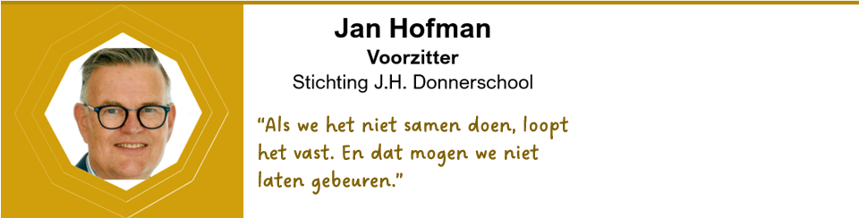 Jan Hofman is directeur-bestuurder van de J.H. Donnerschool, een school voor SO en VSO cluster 4 (gedrag en psychiatrie) in De Glind en Hilversum. Besturen zit hem in het bloed, maar wat hem écht raakte, waren de complexe discussies rondom leerlingenvervoer: ouders in gesprek met gemeenten, gemeenten met scholen en toch kwam men er niet uit. Jan gelooft dat het anders moet én kan: samen. Hij dook zelfs in het Basisboek Leerlingenvervoer en ontdekte hoe belangrijk de wettelijke basis van verordeningen is.